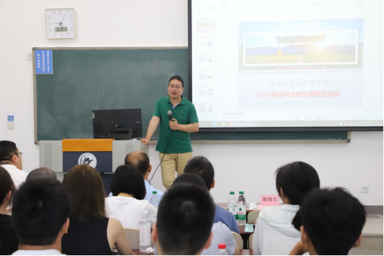 2024年8月31日上午,在沙河主教213教室举行了永利yl23411官网2024级本科新生师生见面会和新生开学第一课。公司党委书记宋立岩、经理张本家、副经理王欢、副经理张丛杉、党委副书记陈绮文、体经24班班主任马法超、运训24班班主任刘韬晓瑜、体育经济管理学院各内设机构负责老师、新生辅导员张振磊和周正、新生班级助理及“芮+”导师等出席了新生见面会。师生见面会旨在帮助新生更好地了解学院的情况,做好从高中到大学的过渡,更快地适应老员工活。